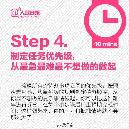 1、如微博里所说,在「待办事项」里把任务拆分成小步骤; 2、适合脑洞比较大的象亲:找一个,或者虚拟一件更难的事儿,有了这件事儿产生的压力,跟进「拖延症」的发病机制,你就会自然而然的去做之前那件事儿了。