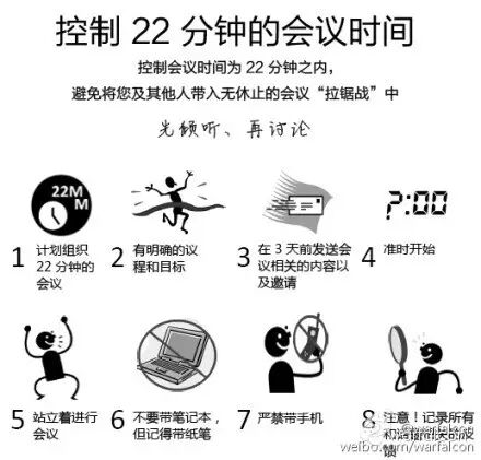 - 准时开始,准时结束,有可能的话,尽量站着开会,这样结束的最快