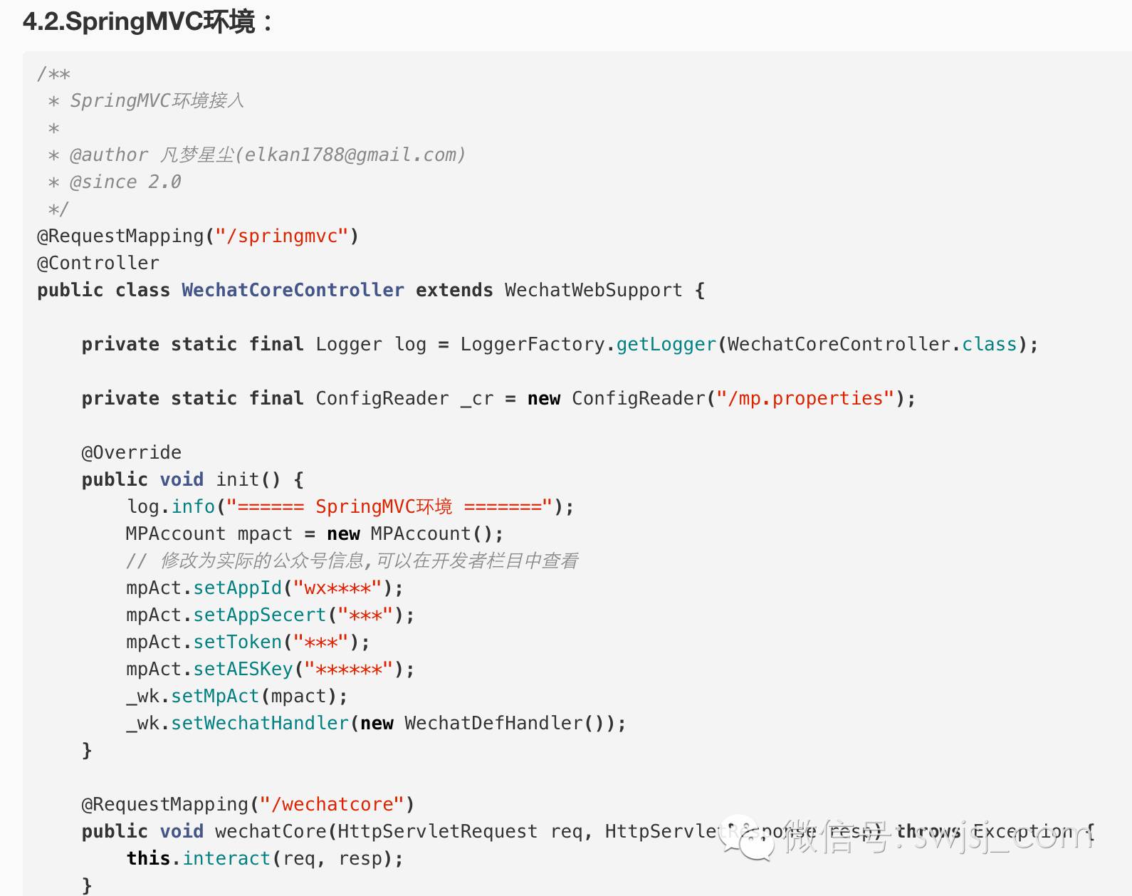 我这里用的是http://git.oschina.net/lisenhui/mpsdk4j这个开源的实现, 可以节约很多时间,当然, oschina上有很多,选一个自己觉得可以的就行了, 都大同小异了。我使用的是ssm框架结构,可以看道文档里面有关于springmvc使用说明,如下图,