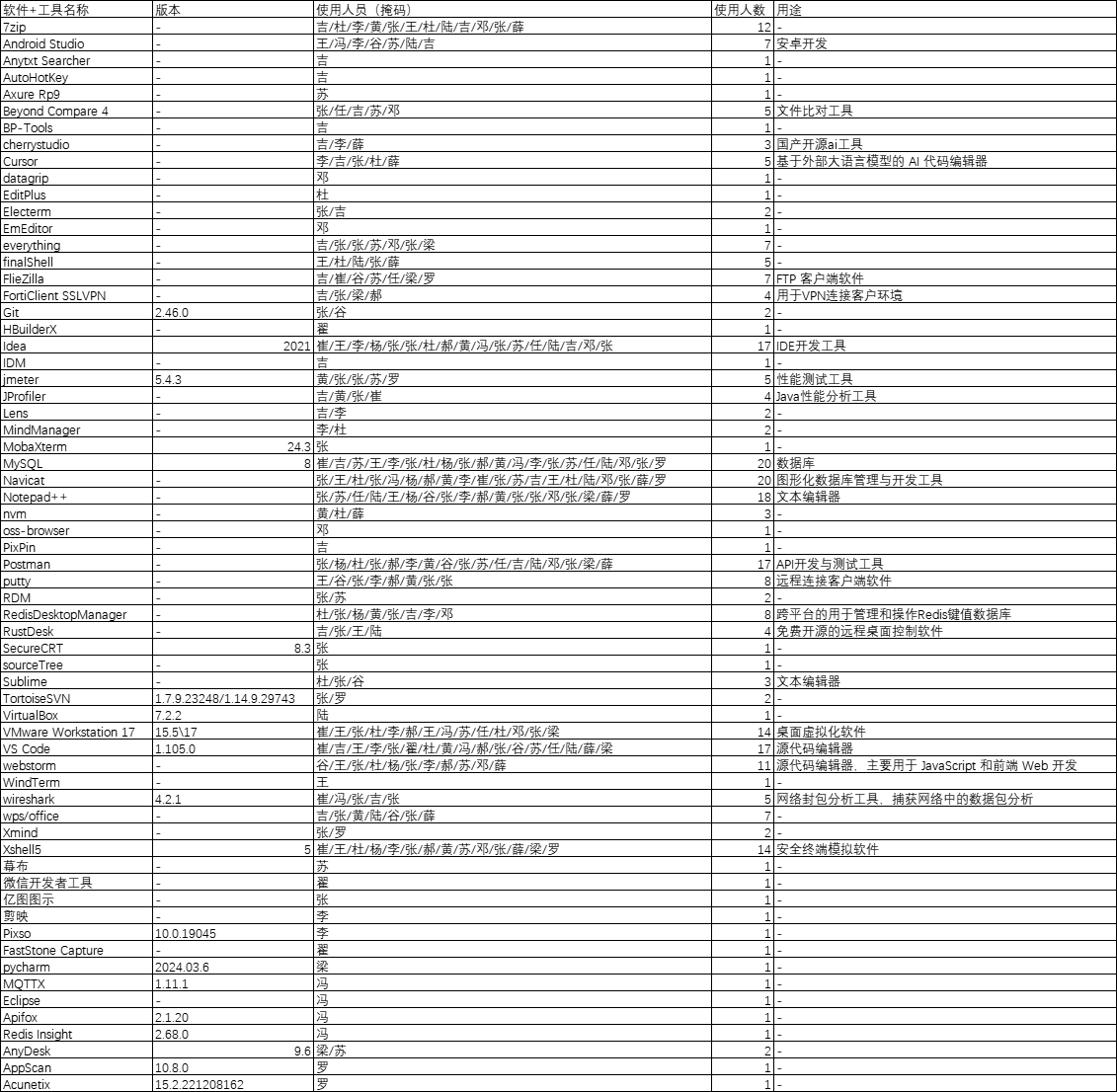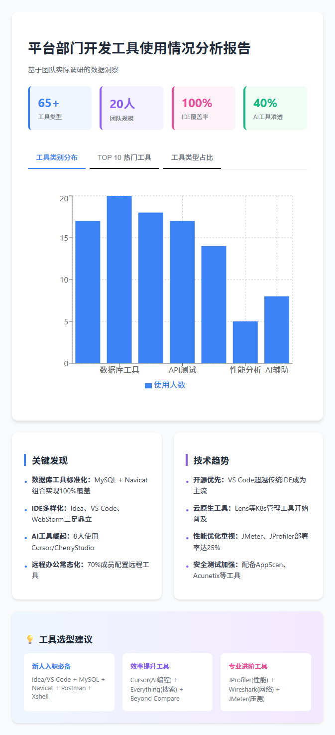 最近我对平台部门做了一次全面的开发工具使用情况调研,统计了65+款软件工具在20人团队中的实际使用情况。这些数据背后,藏着许多有趣的发现和技术趋势。统计数据如下: