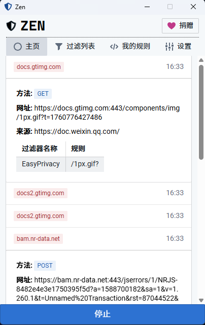 定期检查 Zen 的“请求记录”面板,了解哪些规则拦截了哪些内容:这不仅能帮助你优化过滤列表,也能让你更明白广告/追踪脚本的机制。