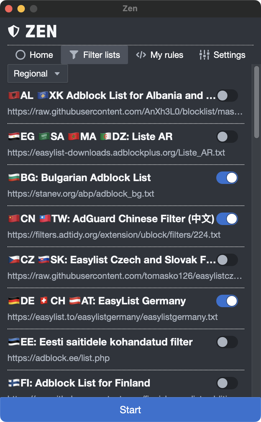 内置丰富规则:Zen 自带广告、隐私、恶意软件过滤器,以及 36 个国家/地区的本地化过滤列表。