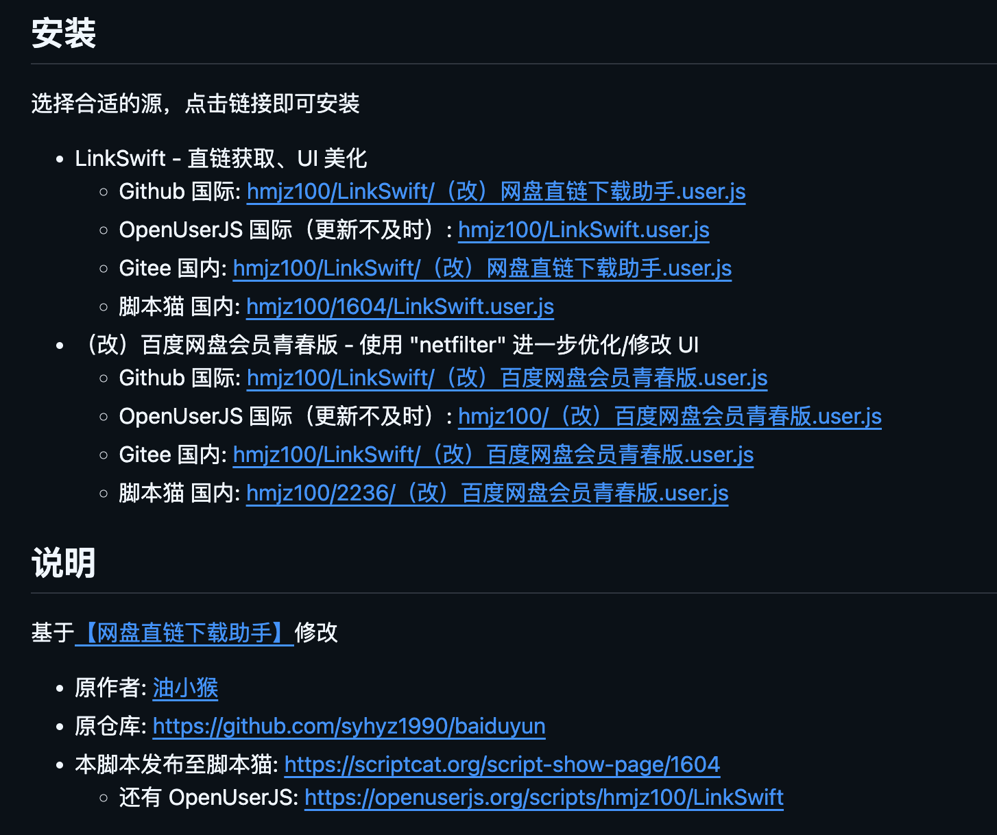 添加脚本:访问 GitHub 仓库(https://github.com/hmjz100/LinkSwift),点击“Install”按钮,或复制脚本代码到 Tampermonkey 新建脚本。推荐从官方源安装,避免假货。